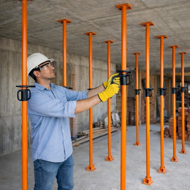 • Escoras metálicas ajustáveis: Tubos telescópicos com alturas reguláveis conforme o pé-direito;