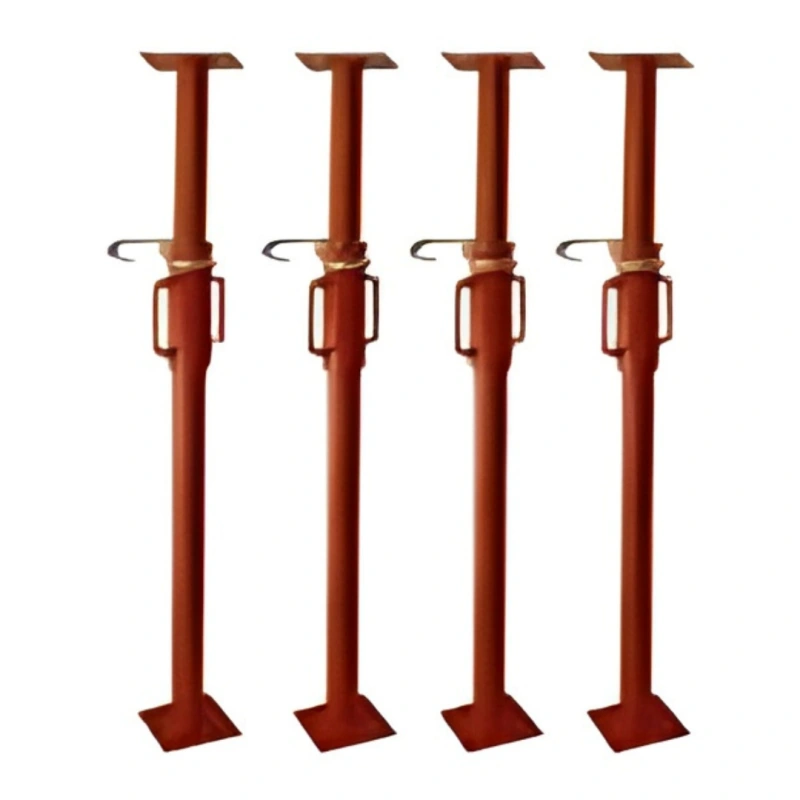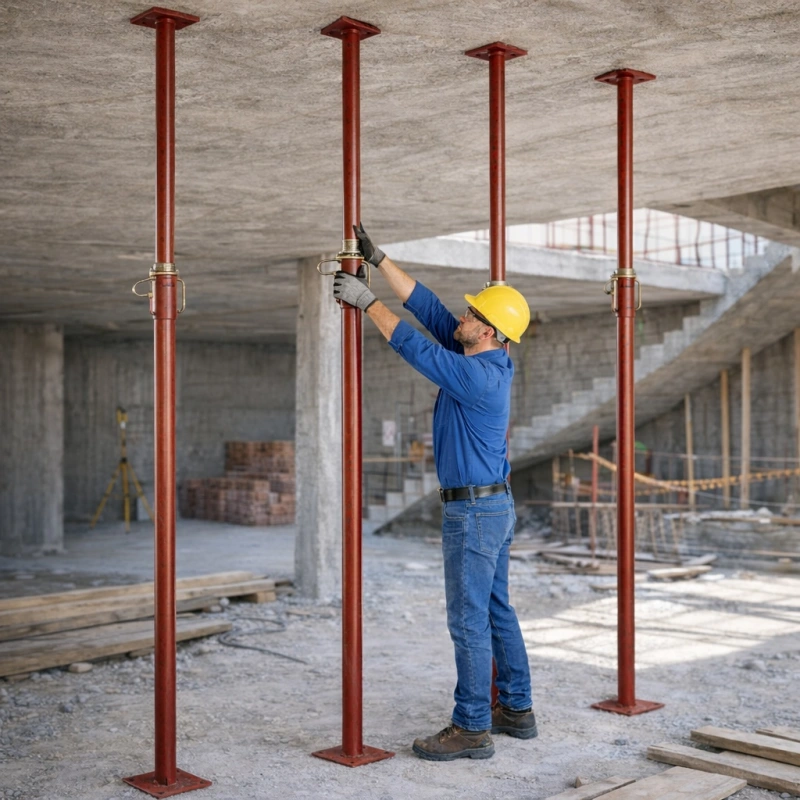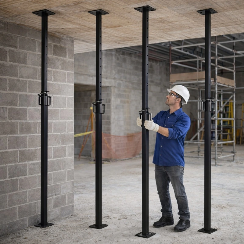- Escoras metálicas reguláveis: Tubos de aço telescópicos com alturas variadas (geralmente de 2m a 4,5m);
