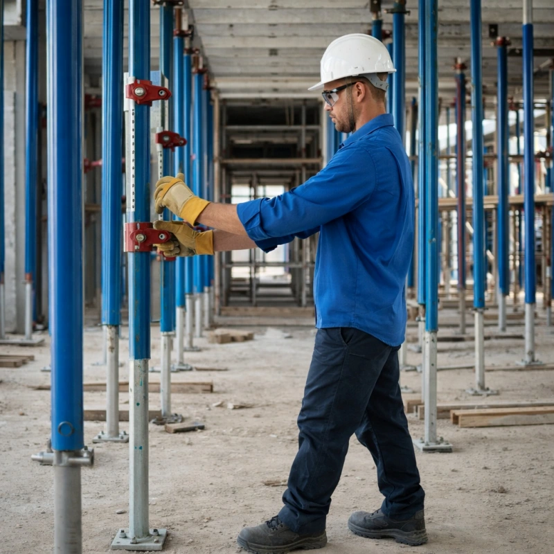 • Escoras metálicas reguláveis: Tubos telescópicos com alturas variadas (geralmente de 2m a 4,5m).