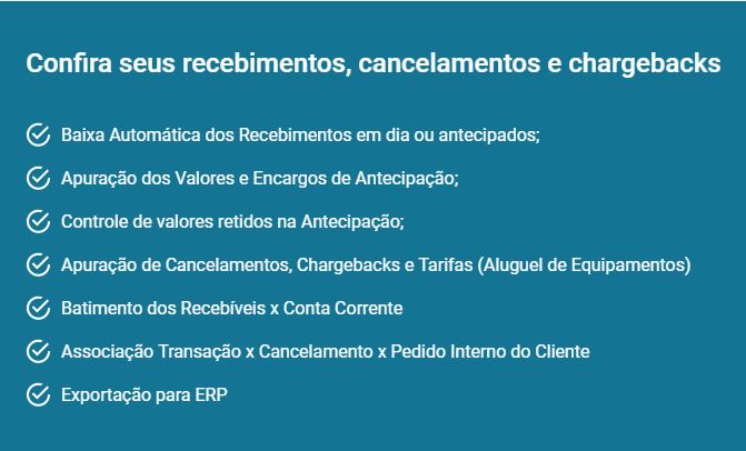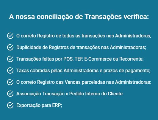 Concilie as transações da sua empresa e tenha certeza que tudo o que você vendeu com cartões foi corretamente capturado pelas Adquirentes.