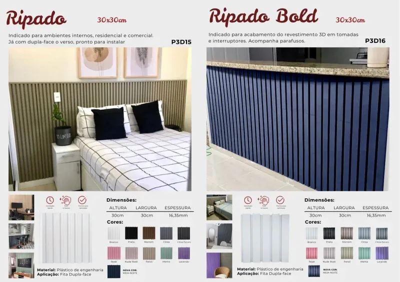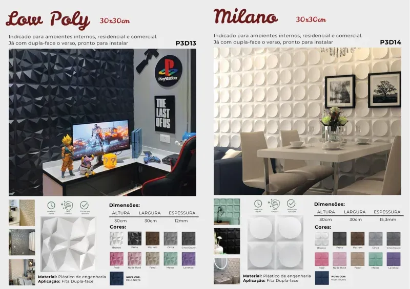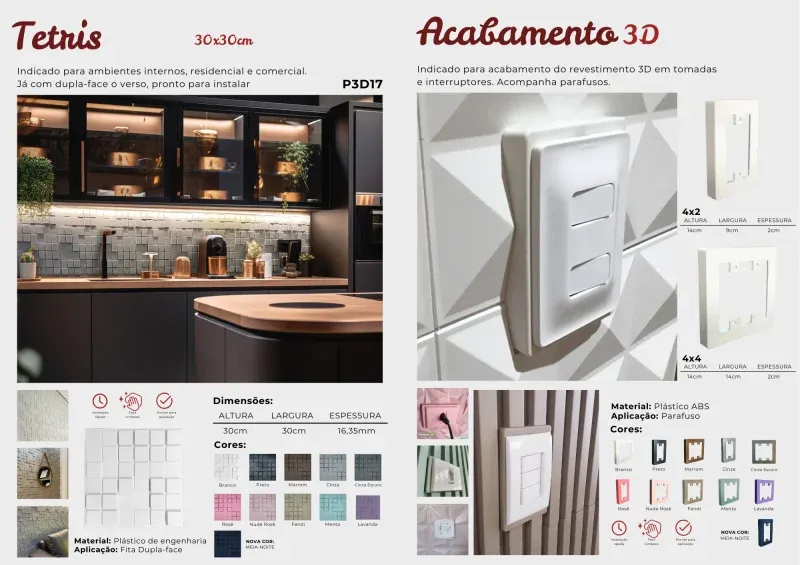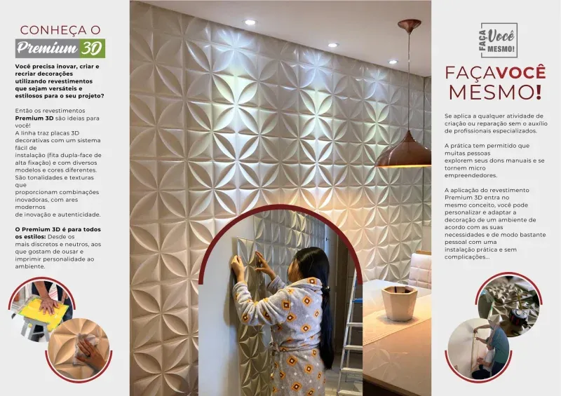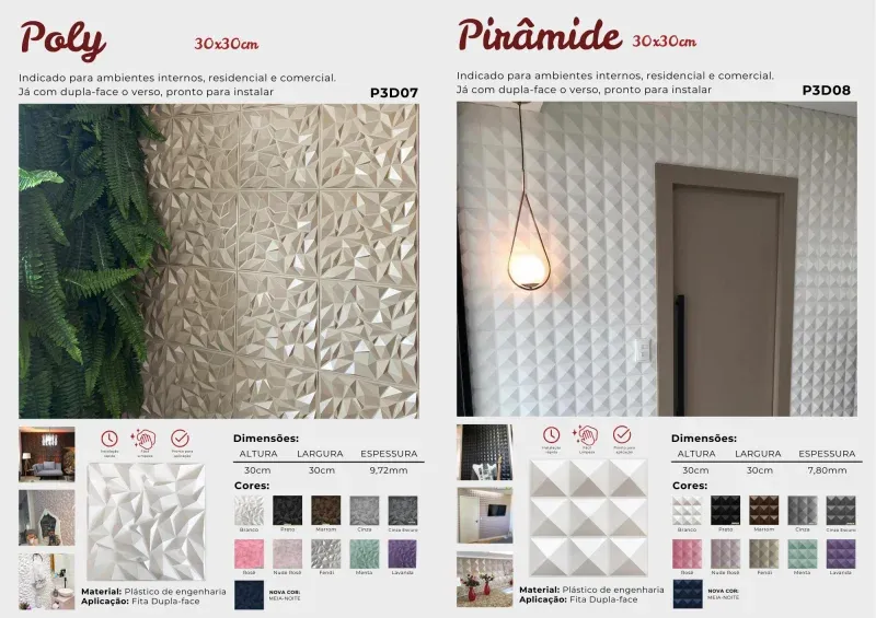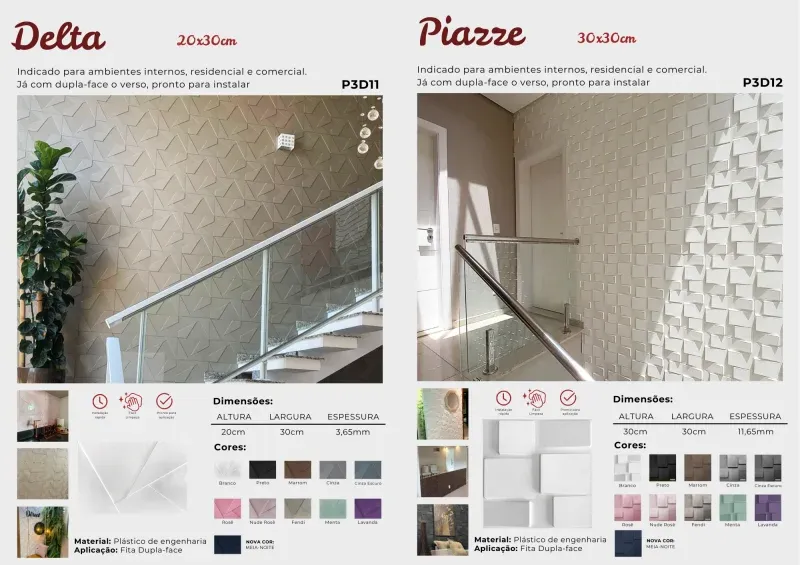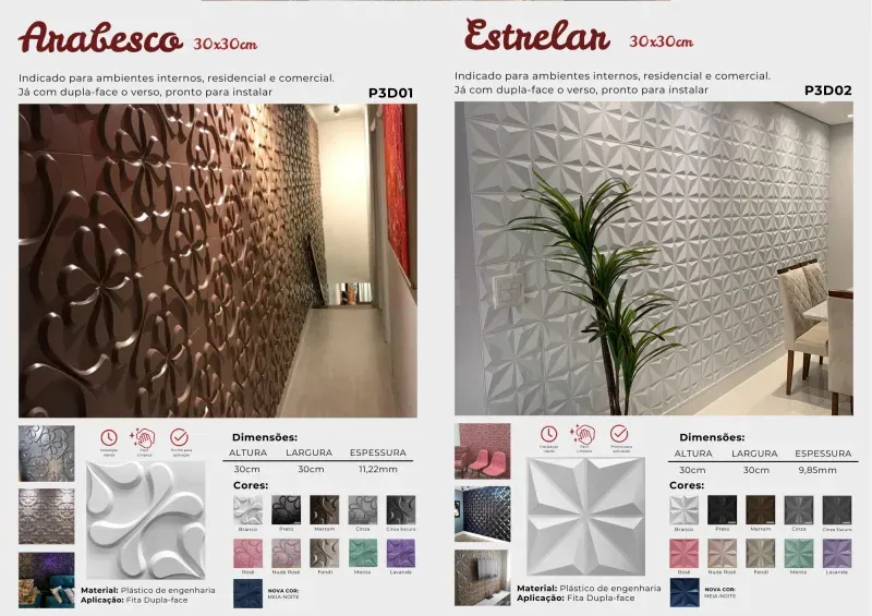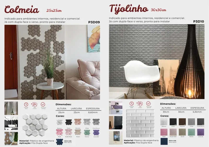 Os revestimentos autocolantes da Brasil Decorar são leves e de fácil instalação, idealmente projetados para áreas internas. Disponíveis em 17 modelos e diversas cores, eles oferecem uma ampla gama de opções para combinar perfeitamente com seu ambiente.