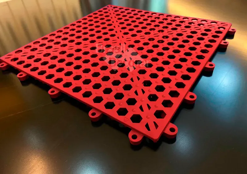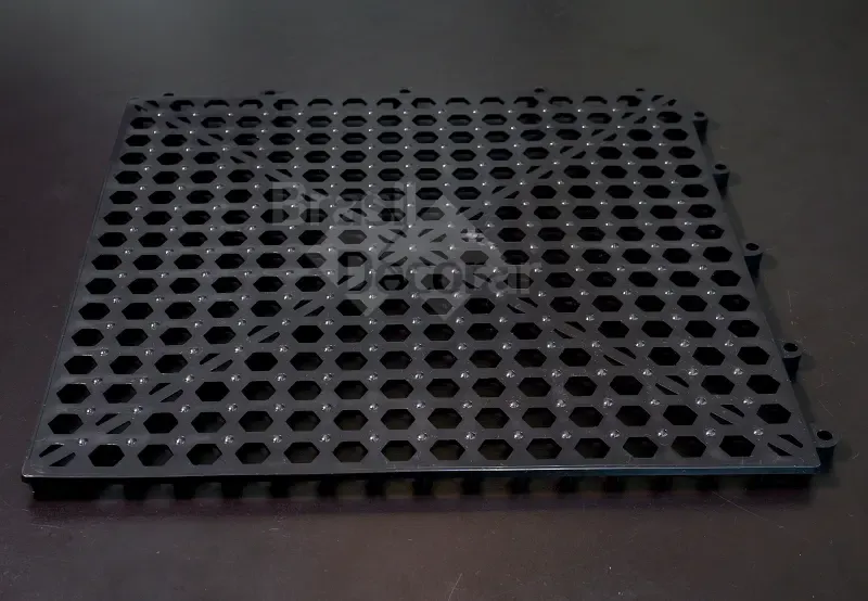 Superfície com micro pinos antiderrapantes em torno de furos hexagonal de 1 x 1mm que facilitam o escoamento da água.