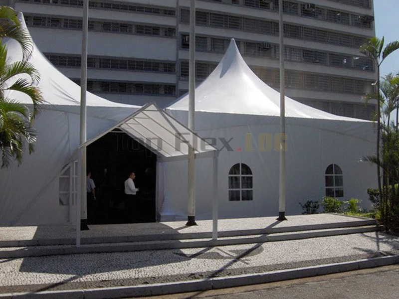 As tendas e suas características: As tendas são produtos feitos de lona - são estruturas isentas de edificações que oferecem uma montagem rápida e prática. Basicamente, trata-se de armações com diferentes tamanhos e formatos - modulares ou não -, feitas de material durável e resistente, com diferentes tipos de encaixe. Além de serem seguras e confortáveis possuem designs diferenciado, trazendo todo um charme para o projeto. Um bom exemplo disso é a tenda chapéu de bruxa.